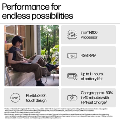 HP Chromebook x360 14 N100/4/128/IPS 14" laptop erbjuder sömlös produktivitet med Intel® N100-processor, 14" IPS-skärm, långvarig batteritid, HD-kamera, snabbt Wi-Fi 6 och Chrome OS för snabba uppstartstider och säkerhet.Läs mer om produkten