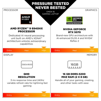 HP OMEN 16 drivs av AMD Ryzen™ 9 8940HX-processorn med 16 kärnor och en maximal turbofrekvens på 5,3 GHz. Detta säkerställer smidig multitasking och effektiv hantering av intensiva applikationer. Den bärbara datorn har också 16 GB DDR5 RAM med en minneshastighet på 5200 MT/s, vilket ger snabb och responsiv prestanda för spel och andra krävande uppgifter.