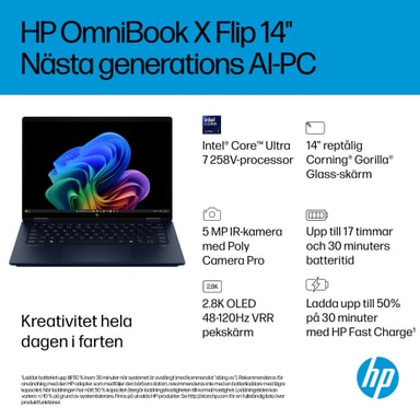Ta din kreativitet med dig med den tunna och lätta HP OmniBook X Flip 14 Next Gen AI PC. Flera lägen gör att du kan arbeta och spela från alla vinklar, medan en 2,8K OLED-skärm gör varje vy levande. En AI-driven processor och ett snabbladdande batteri som räcker hela dagen säkerställer att du har hastigheten, prestandan och uthålligheten för att skapa var du än är.