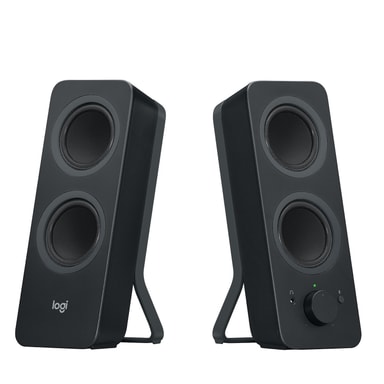Små och mångsidiga men ändå förvånansvärt kraftfulla. Logitech Z207 Bluetooth högtalare bjuder på en imponerande stereoupplevelse. Två högtalarelement per högtalare ansvarar för mitt- och höga toner. De två andra elementen i varje högtalare tar sig an de låga tonerna, och därför får du ett balanserat ljud. Logitech Easy-Switch låter dig ansluta två Bluetooth-enheter och en enhet via 3,5 mm mini-jack, så du enkelt byter ljudenhet. Den högra högtalaren har alla kontroller på sig, så som Bluetooth-parningsknapp, Av/På-knapp samt en volymkontroll. Här hittar du också hörlursutgången.