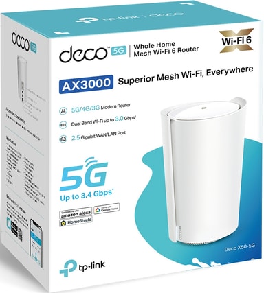 Upplev ultrasnabb och stabil trådlös internetanslutning tack vare TP-Link DecoX50 AX3000 Mesh WiFi-router, som har ett inbyggt 5G-modem, dual-band WiFi 6, 3 LAN-portar, internethastighet på upp till 3Gbps och TP-Link Mesh-teknik.Läs mer om produkten