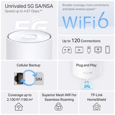 TP-Link Deco X10 WF6/AX1500 5G mesh-router levererar 5G-anslutning, 1 ms latens, dubbelband Wi-Fi 6 och sömlös mesh-täckning för upp till 120 enheter, allt med enkel plug-and-play-installation och robust säkerhet.Läs mer om produkten