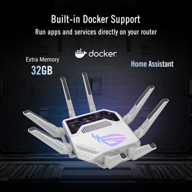 Det inbyggda Docker-stödet låter avancerade användare köra appar och tjänster direkt på routern. Detta gör det enkelt att hantera anpassade verktyg, servrar eller smarta funktioner utan att behöva extra hårdvara.