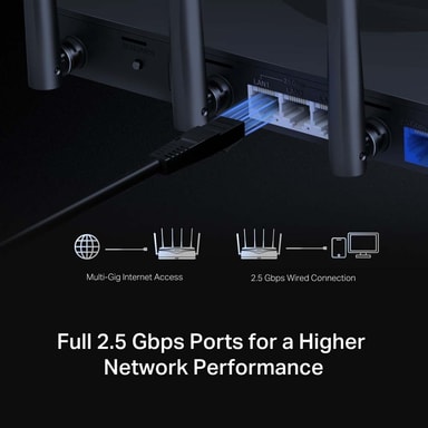 Har 4× 2,5G-portar, inklusive 1×2,5 Gbps WAN-port och 3×2,5 Gbps LAN-portar bryter igenom 1G-flaskhalsen för att driva dina enheter till topprestanda.