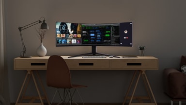 Njut av ett ultrabrett synfält – dubbelt så brett som en traditionell 16:9-skärm. Upplev en omslutande vy där flera fönster kan visas samtidigt på en enda skärm, vilket eliminerar behovet av att ständigt växla mellan dem.