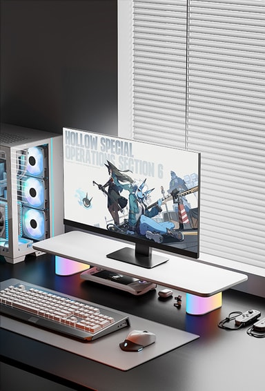 Med levande flerfärgs-RGB-belysning förvandlar stället din arbetsplats till en stämningsfull miljö. Välj mellan tre dynamiska lägen—6-färgad regnbågsgradient, 7 statiska färger och 6-färgad andningseffekt, för att matcha din sinnesstämning eller setup och ge ditt skrivbord ett stilrent sken. Ett diskret placerat belysningshjul möjliggör sömlöst byte mellan RGB-lägena utan att störa ställets minimalistiska design. Denna dolda kontroll säkerställer enkel åtkomst samtidigt som estetiken förblir ren och städad.