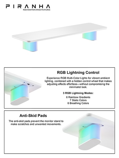 Piranha RGB-monitorstället kombinerar förbättrad arbetsergonomi med stämningsfull belysning för din arbetsplats. Med tre anpassningsbara RGB-lägen, ett diskret kontrollhjul för belysningen, antiglidkuddar för stabilitet och enkel montering är den byggd för både stil och användarvänlighet.