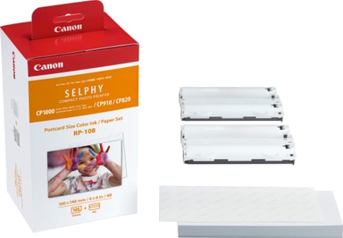 Canon RP-108 kit med papper och färgbläck för Canon Selphy CP1300-skrivare säkerställer högkvalitativ utskrift av dina bilder med färgbläck och 108 vykortstorlekar bekvämt ihopbuntade.Läs mer om produkten