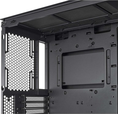 Midi-tower i stål och härdat glas med modulära nätpaneler ger ett rent, modernt utseende. Nätdelskåpan och de främre nätpanelerna döljer kablar samtidigt som luftflödet bibehålls.