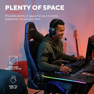 Trust GXT709 LUMINUS RGB skrivbord för gaming har integrerad RGB-belysning som är lätt att styra med pekkontrollpanelen. Dessutom gör mugghållaren och headsetkroken livet enklare.Läs mer om produkten