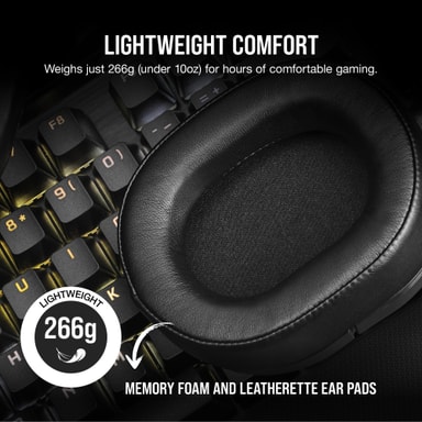HS55 Surround stödjer ultrauppslukande Dolby 7.1-surroundljud som aktiveras av CORSAIR iCUE-programvaran, och överför varje liten detalj i 3D-utrymmet till dina öron. Fördjupa dig i miljön och hör detaljerade ljud från alla vinklar.