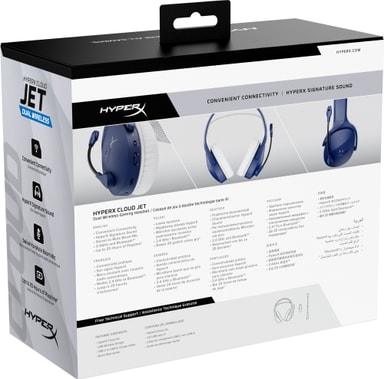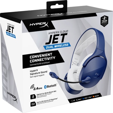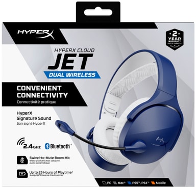 HyperX Cloud Jet trådlöst gamingheadset har dubbla 2,4 GHz/Bluetooth 5,2-anslutningar, 40 mm ljuddrivrutiner, brusreducerande mikrofon, 25 timmars batteritid, i en lätt, bekväm design för spel på PC, konsol och mobil.Läs mer om produkten