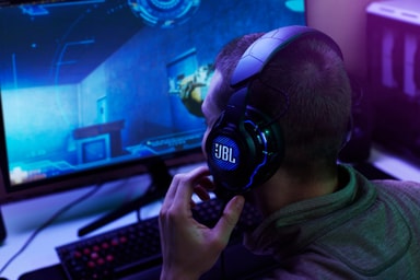 Öronkåporna lyser i sprakande färger. Med JBL QuantumENGINE kan du välja från hela spektrumet av RGB-färger och skapa dina egna effekter.