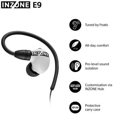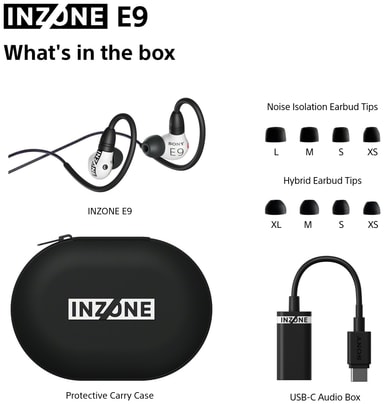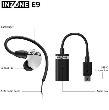 När headsetet är anslutet via den medföljande USB-C-ljudboxen och används med INZONE Hub PC-programvaran kan E9 leverera virtuellt 7.1-kanals surroundljud och Sonys 360 Spatial Sound för gaming, vilket hjälper till med exakt ljudpositionering.