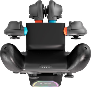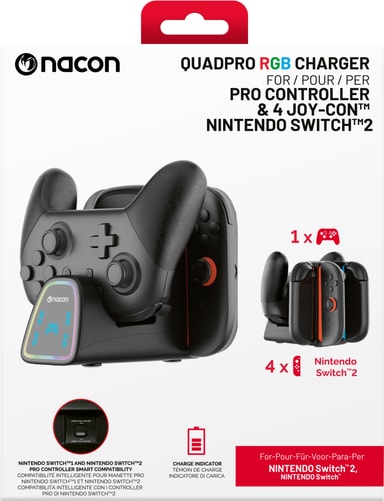 Ladda alla dina JoyCons och en kontroll samtidigt med Nacons laddningsstation för Switch 2-kontroller. Kompatibel med Switch och Switch 2, utrustad med RGB-belysning och USB-strömkoppling som laddar alla dina Nintendo-kontroller samtidigt.
