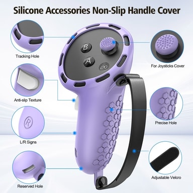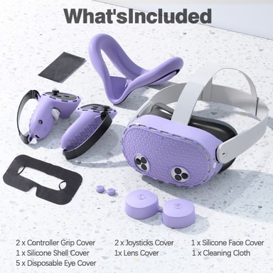För Meta Quest 3S silikontillbehörsset med VR-headsetskydd / kontrollgrepp / ansiktsmask - Lila【Komplett skydd】 Silikonset i sju delar ger omfattande skydd för ditt VR-headset och dina kontrollenheter.【Perfekt passform】 Specialgjuten design säkerstälLäs mer om produkten