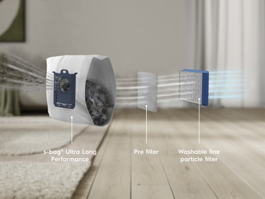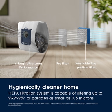 Dammsugaren har ett tvättbart HEPA fint dammfilter som kan fånga upp djurpäls, damm och smuts från alla ytor.