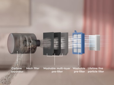 HEPA 11-filtret fångar även de minsta dammpartiklarna, vilket säkerställer en ren och pollenfri miljö efter varje dammsugning. Dessutom är filtret tvättbart, vilket betyder att du kan ta ut det, rengöra det och sätta tillbaka det i dammsugaren.