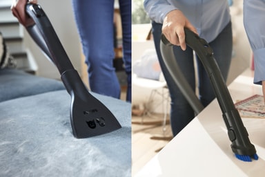 Dammborsten är inbyggd direkt i handtaget så att du kan använda den direkt. Dammsugaren är även utrustad en med Turbo-borste som enkelt tar hand om husdjurshår samt ett möbelmunstycke som är utformat för rengöring av mjukare ytor som kuddar och möbelklädsel.