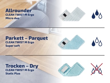 För snabb och hygienisk rengöring. CLEAN TWIST M Ergo static plus-mopphuvudet är tillverkat av polyesterfibrer, som blir elektrostatiskt laddade under rengöring. Det samlar upp damm, smuts och till och med djurhår som en magnet och håller kvar det.Läs mer om produkten