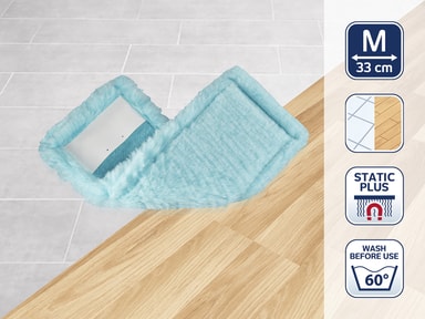 För snabb och hygienisk rengöring. CLEAN TWIST M Ergo static plus-mopphuvudet är tillverkat av polyesterfibrer, som blir elektrostatiskt laddade under rengöring. Det samlar upp damm, smuts och till och med djurhår som en magnet och håller kvar det. Wiper Cover Static är extra mjukt, kan tvättas i 40 grader och behåller sin funktion även efter upprepade tvättar. Tillsammans med CLEAN TWIST M Ergo-setet är det den perfekta rengöringslösningen för alla släta golv samt parkett och laminat. Torkbredden är 33 cm. Passar både Clean Twist M Ergo och PowerClean M.