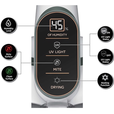 Utformad för att bidra till att minska bakterier, allergener och dammkvalster inbyggda sensorer säkerställer att UV-ljuset endast aktiveras när det är i direkt kontakt med ytan och stängs av automatiskt när det lyfts från ytan.