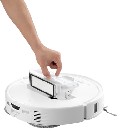 Dockningsstationen tömmer automatiskt dammbehållaren, fyller på vattentanken och rengör sig själv med roterande skrapor och varmvatten, vilket minskar behovet av manuellt underhåll i upp till 7 veckor.