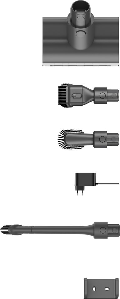 Tillsammans med dammsugaren följer det med en uppsättning med tillbehör, som en motoriserad miniborste, ett flexibelt kombinationsredskap och ett praktisk väggfäste.