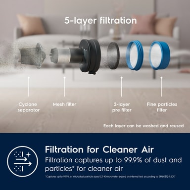 *****Avlägsnar upp till 99,9% av mikdrodammpartiklar i storleken 0,35–10 μm*, baserat på interna tester enligt EN60312-1:2017.