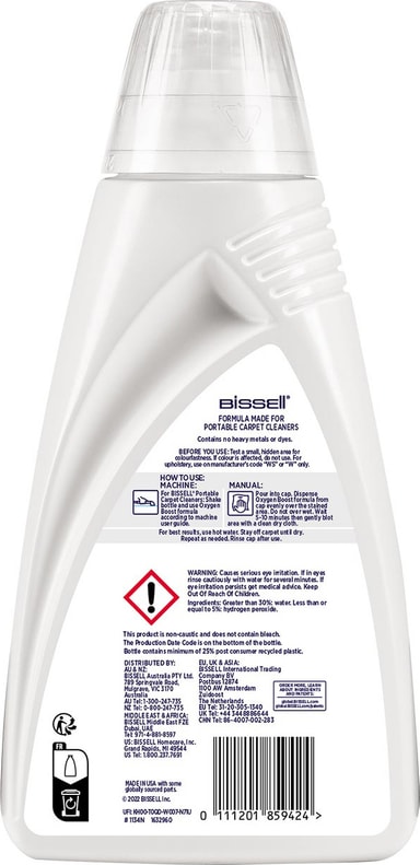 BISSELL Oxygen Boost SpotClean / SpotClean Pro 1 ltr. Tar bort svåra fläckar permanent från ett stort antal olika material. Kan appliceras direkt på mattfläckar eller förbehandla din tvätt. Lämplig för användning med BISSELL Power Tool, Spotbot, Spotclean bärbara maskiner. Ej lämplig för användning på sammet, chenille, siden, dralon eller läderBISSELLs nya generation rengöringslösning tränger djupt in för att avlägsna märken och återuppliva mattor. Med en kraftfull syreeffekt tränger BISSELLs nya generation rengöringslösning djupt in för att avlägsna märken och återuppliva mattor. även ökända svåra fläckar av rött vin, kaffe, cola och fruktjuice har ingen chans. Oxygen Boost är speciellt gjord för att få bästa möjliga resultat från SpotClean, och kan också användas i Oxy PowerTool med upprätta mattrengörare, eller manuellt som en förrengörare för tvättfläckar, lägg helt enkelt till en mängd till din vittvätt för att öka effekten av ditt tvättmedel.