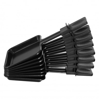 Raclettegrillen är elegant i svart och smart designad med både en stek- och grillyta och en effektiv fonduegryta med 6 gafflar. Temperaturen är justerbar, en lampa indikerar värmen och 8 minipannor med nonstick-beläggning medföljer.