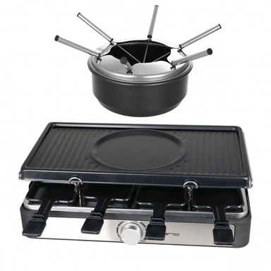 Denna funktionella och effektiva raclette-grill med en fondue-gryta gör middagen till ett rent nöje. Låt bordet fyllas med olika ingredienser och låt alla göra sin egen favorit-måltid. Tillaga maten genom att använda fonduegrytan, de 8 minipannorna med non-stick beläggning och grillplattan med ett utsökt resultat för alla smaker.