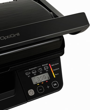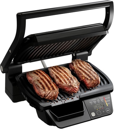 Inbyggd sensor: Denna grill är utrustad med en sensor som automatiskt känner av tjockleken på maten som tillagas och ställer in temperaturen därefter, från 120°C till 270°C.