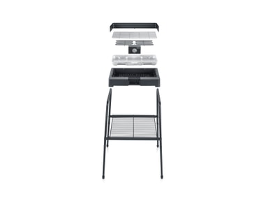 Elektrisk grill med ben och förvaringshylla, för både inomhus- och utomhusbruk. Det praktiska SafeTouch-höljet gör att grillen kan användas på alla typer av underlag. Enkel att plocka isär och rengöra. 2200 watt.PG 8566Stek saftiga biffar på denna smarta elgrill, som med sina avtagbara ben även kan användas som bordsgrill. Med grillgaller i högkvalitativt rostfritt stål får du en spröd stekyta och saftiga biffar. En smart vindskärm på 8 cm ingår. Använd den med fördel när du grillar i trädgården, på terrassen eller andra platser där vinden annars kan ställa till det för grillmästaren. Grillen är otroligt enkel att använda med ett vred som kan justerar temperaturen.Grillyta på 44,5 x 26 cm8 cm hög vindskärm SäkerhetsbrytarePÅ/AV-knapp med inbyggd indikatorlampa1,4 m sladdMått (inkl. vindskärm och utan ben): bredd 52 cm, höjd 15 cm, djup 39 cmArbetshöjd: 85 cm 2200 wattFärg: Svart Vikt: 5,1 kg