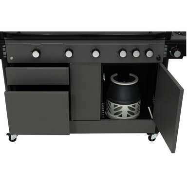 Grillens stomme är i pulvermålat stål. Sidobordet har en tillbehörskorg och hängkrokar. Skåpen öppnas genom att trycka in dem. 2 små och 2 låsbara flytthjul.