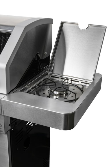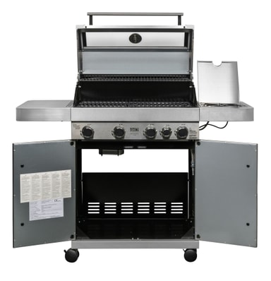 Grillen har dubbelisolerat lock med fönster och termometer, fyra huvudbrännare i rostfritt stål (#304), integrerad tändning, emaljerad grillbox och flamskydd, grillgaller i matt emaljerat gjutjärn, MGS-system för varierad grillning, värmehylla, stort sidobord med en sidobrännare, bas med förvaringsskåp och fyra låsbara hjul. Grillyta 73,5 x 45 cm + värmehylla. Mått efter montering: 138 x 60 x 116 cm. Effekt: 17 kW. För enkel montering och bra tips, skanna QR-koden i manualen och följ instruktionsvideon steg för steg.