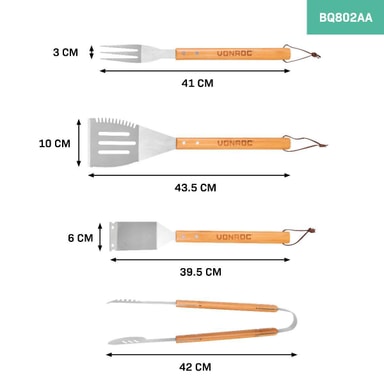 Saftiga hamburgare, goda grönsaker och perfekt grillade biffar. Grillredskapssetet från VONROC förbereder du alltid den perfekta rätten! Grillverktygen är utrustade med eleganta bambuhandtag och slitstarkt rostfritt stål, vilket gör dem helt vattentåliga och lätta att rengöra. Tack vare den avsevärda längden (± 40 cm) kan du arbeta bekvämt och på säkert avstånd från den heta grillen.