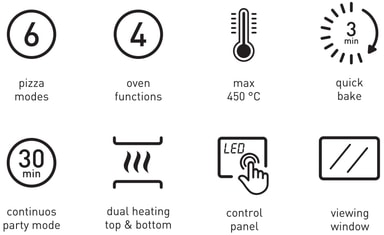 Denna mångsidiga ugn erbjuder fyra huvudfunktioner - grill, baka, gratinera och rosta - vilket gör den lämplig för en mängd olika matlagningsbehov utöver pizza. Med dubbla värmeelement och exakt temperaturkontroll säkerställs en jämn tillagning.