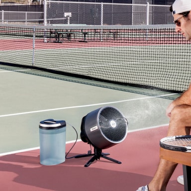 Denna fläkt kan användas som en piedestalfläkt och en bordsfläkt med en knapptryckning. Den sprayar och oscillerar i båda lägena. Fläkten är lämplig för både inomhus- och utomhusbruk, med en väderbeständig, UV- och vattenbeständig design. Lätt att bära med sig tack vare den integrerade, bärbara och avtagbara MistPro-tanken, vilket möjliggör enkel kylning var som helst utan behov av slang eller vattenhink.
