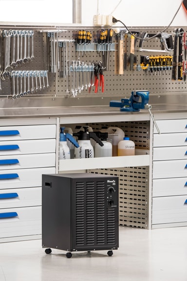 Denna avfuktare är speciellt designad för källare. Den är lätt att flytta runt tack vare handtaget och du kan antingen använda vattentanken på 11.4 l eller ansluta den till direkt dränering.