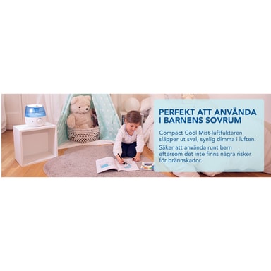 Kompakt Cool Mist luftfuktare, idealisk för användning i ett barns sovrum: Känn dig lätt att andas. Den har även regleringsbrytare för dimutgång för att justera fuktnivån.