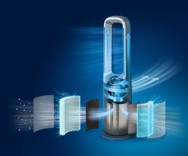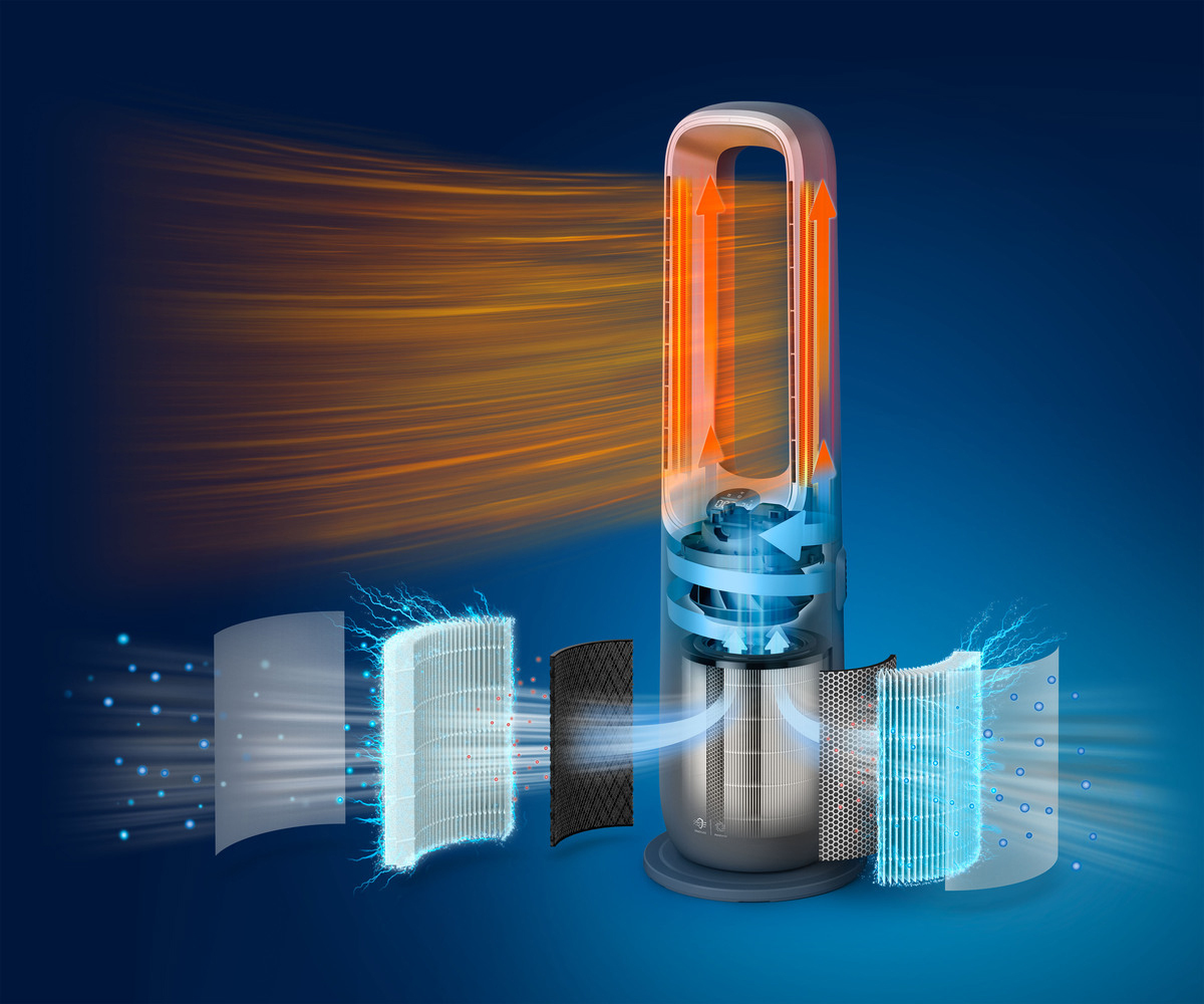 3-i-1-design: Luftrenaren fungerar även som fläkt och värmare. Den bladlösa designen fördelar luften jämnt i hela rummet, vilket ger en jämn ström av frisk luft.