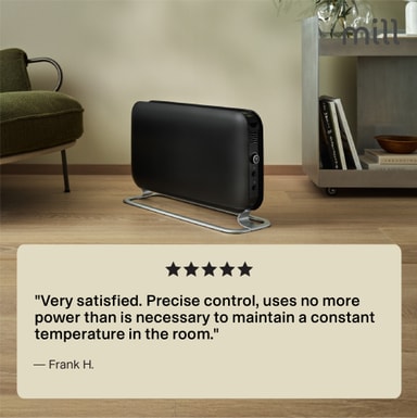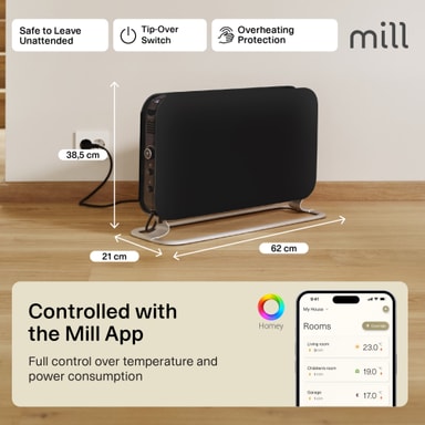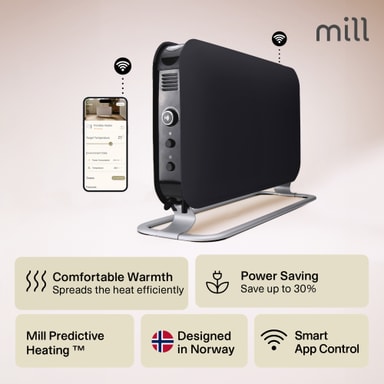 Mill Wi-Fi golvelement CO1200WIFI3BLACK är idealisk för att värma upp rum så stora som 18 m2. Den använder Mill PID Wattage Tech och Predictive Heating-system för att bibehålla idealisk temperatur och hålla ditt utrymme varmt och mysigt.Läs mer om produkten