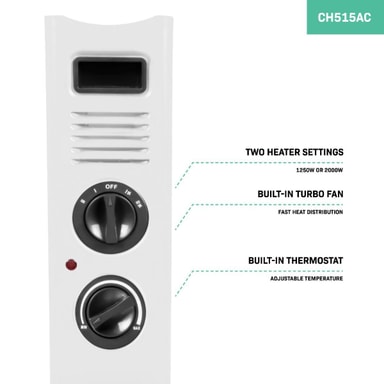 Den här modellen erbjuder två värmeinställningar, 1250W eller 2000W. Du har full kontroll över elementets intensitet. Använd den inbyggda termostaten för att ställa in önskad temperatur. Den inbyggda turbofläkten ger en supersnabb värmefördelning. Turbofläkten kan naturligtvis stängas av när du föredrar fullständig tystnad.