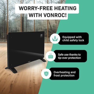 Naturligtvis har vi ägnat stor uppmärksamhet åt säkerheten. Därför har vi utrustat elementet med ett barnsäkert lås för att undvika oavsiktliga justeringar av inställningarna. Dessutom är den är modellen försedd med fall och överhettningsskydd. Detta innebär att värmaren automatiskt stängs av om den skulle välta eller om den skulle bli överhettad.