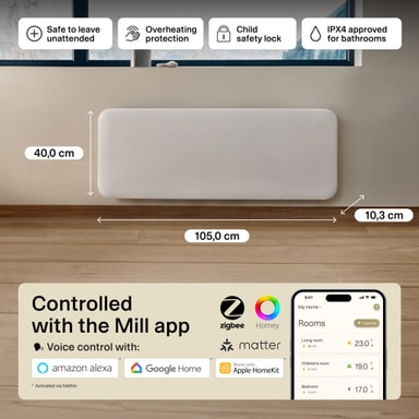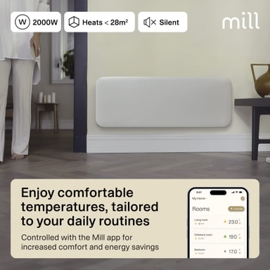 Mill Invisible Smart WiFi Panelvärmaren 2000W Gen. 4 är kompakt och värmer rum upp till 28 m². Värmaren har en elektronisk termostat och är säker att använda i våtutrymmen. För ökad kontroll kan den anslutas till Mill Wi-Fi-appen.Läs mer om produkten