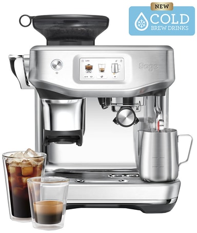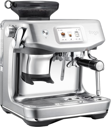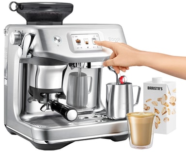 Sage Barista SES882BSS har 8 förinställningar, 30 malningsfunktioner, kallbryggning, Impress Puck System för malning och dosering, Auto MilQ för mikroskum och ThermoJet för 3 sekunders uppvärmning.Läs mer om produkten