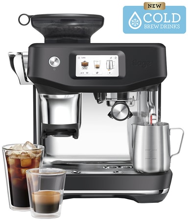 Sage Barista SES882BTR har 8 förinställningar, 30 malningsfunktioner, kallbryggning, Impress Puck System för malning och dosering, Auto MilQ för mikroskum och ThermoJet för 3 sekunders uppvärmning.Läs mer om produkten