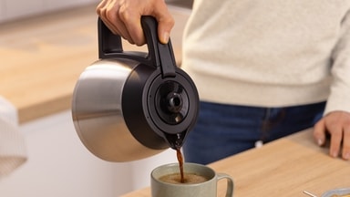 Den högkvalitativa termoskannan i rostfritt stål är gjord för 8 stora/12 små koppar (1 liter), skyddar aromen och håller ditt kaffe varmt längre. Tack vare den dubbelsidiga väggen blir ytan på kannan inte varm och du kan röra den utan bekymmer.