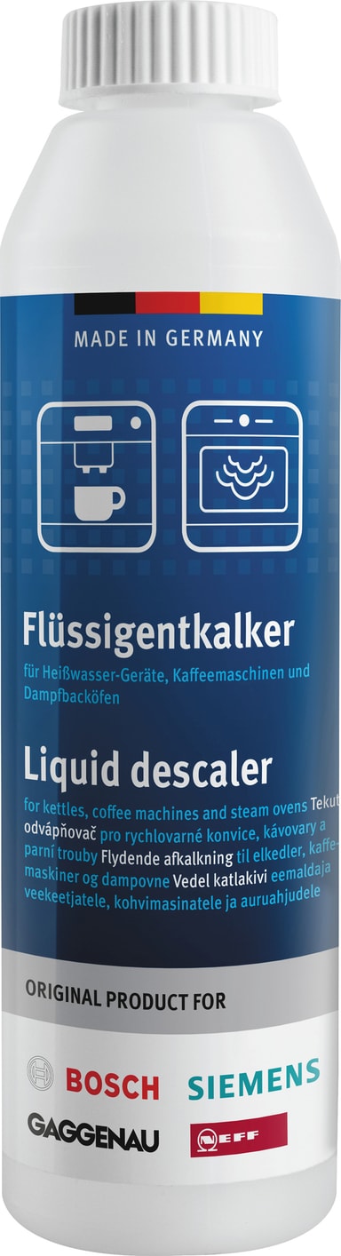Bosch flytande avkalkningsmedel BSH352748 tar enkelt och effektivt bort kalkavlagringar i din vattenkokare, kaffebryggare eller ångugn. Medlet är biologiskt nedbrytbart och miljövänligt.